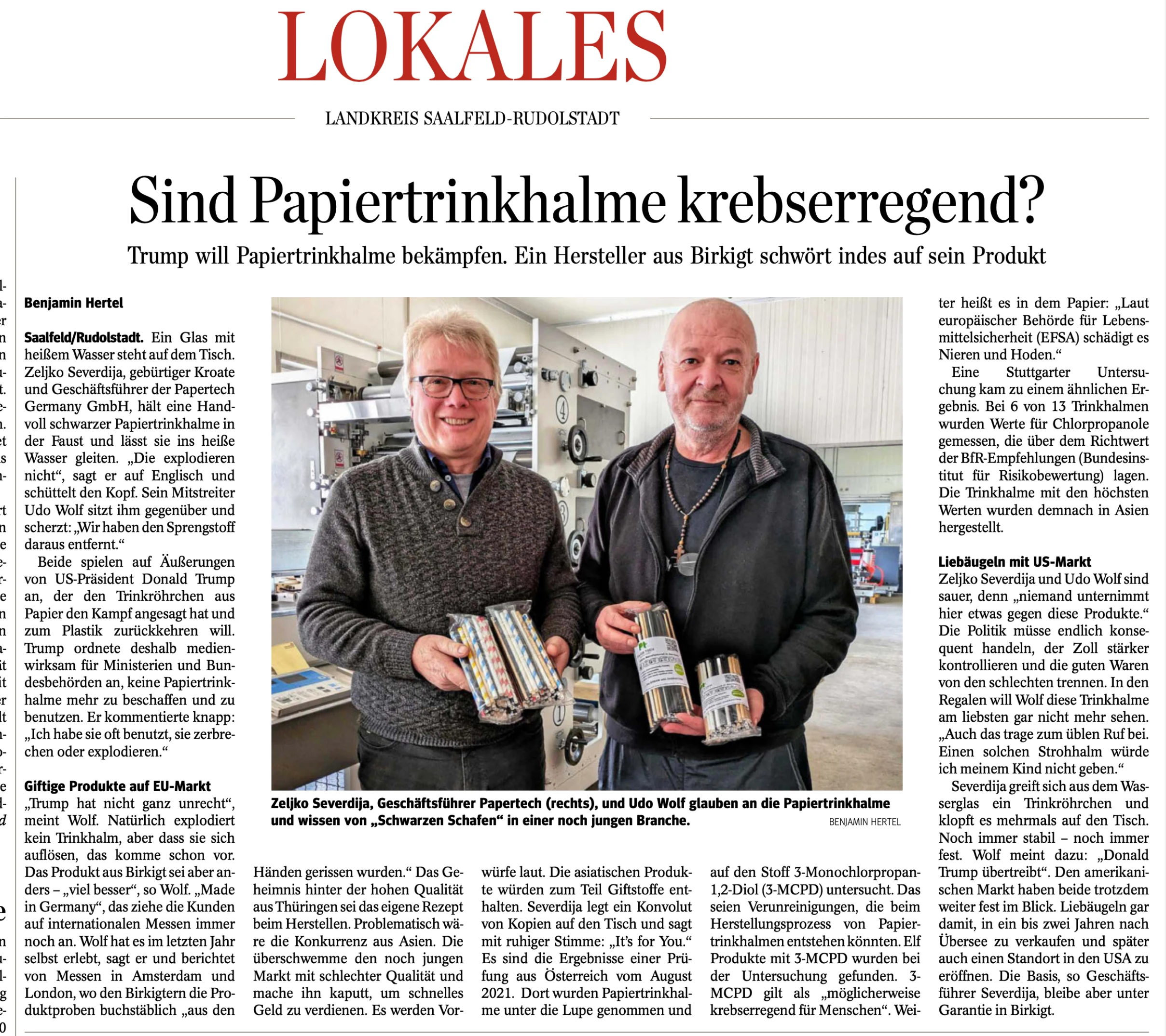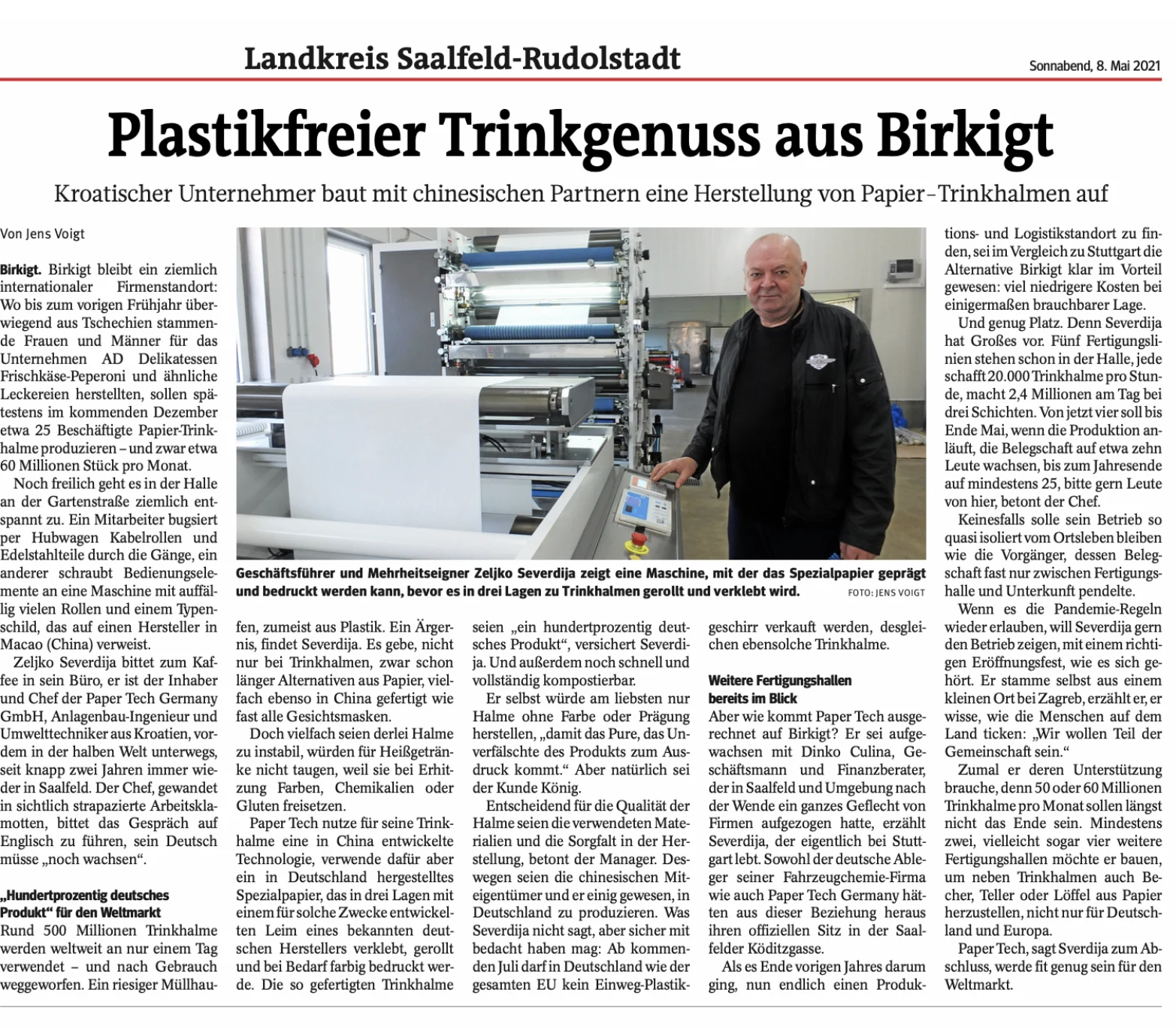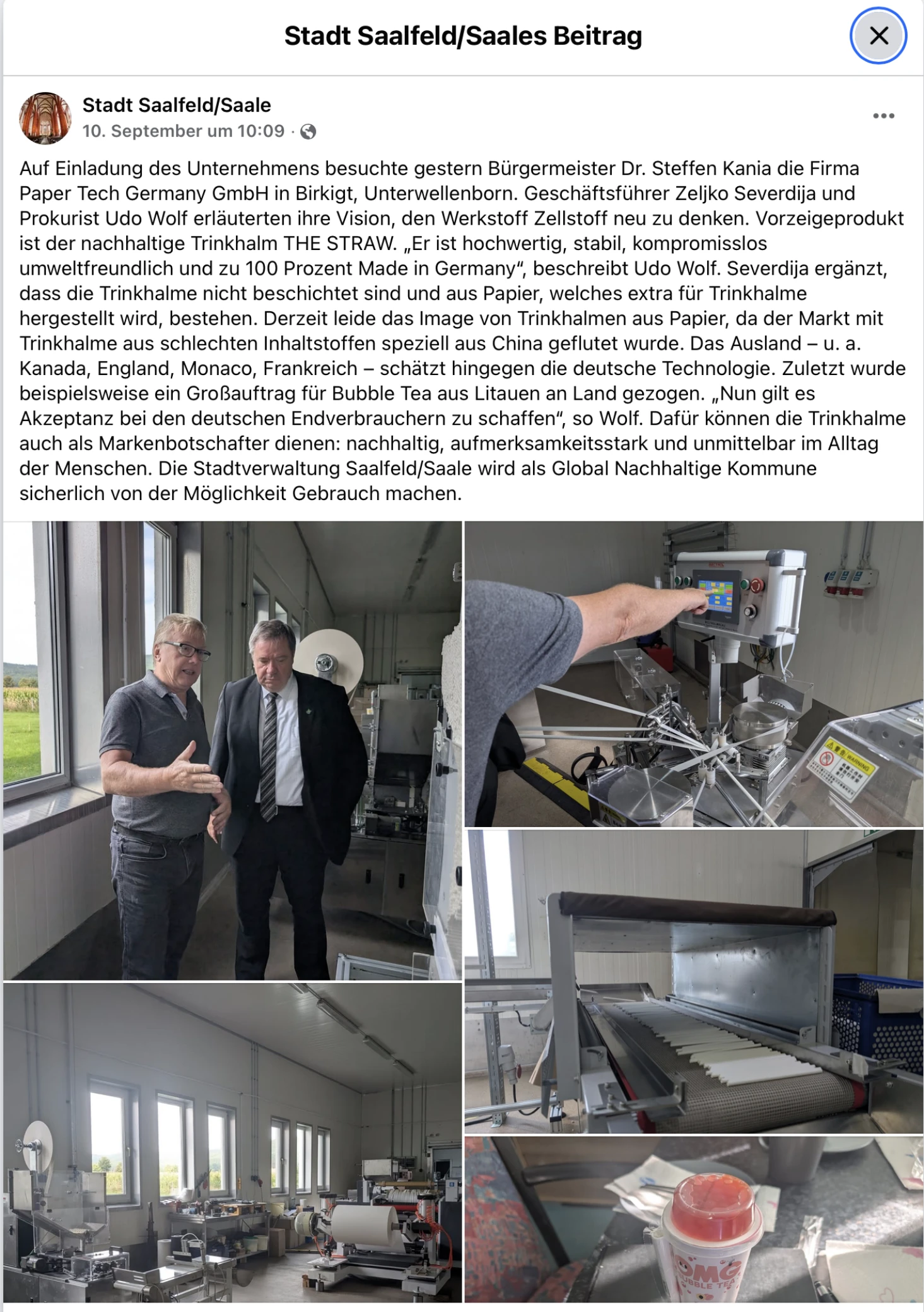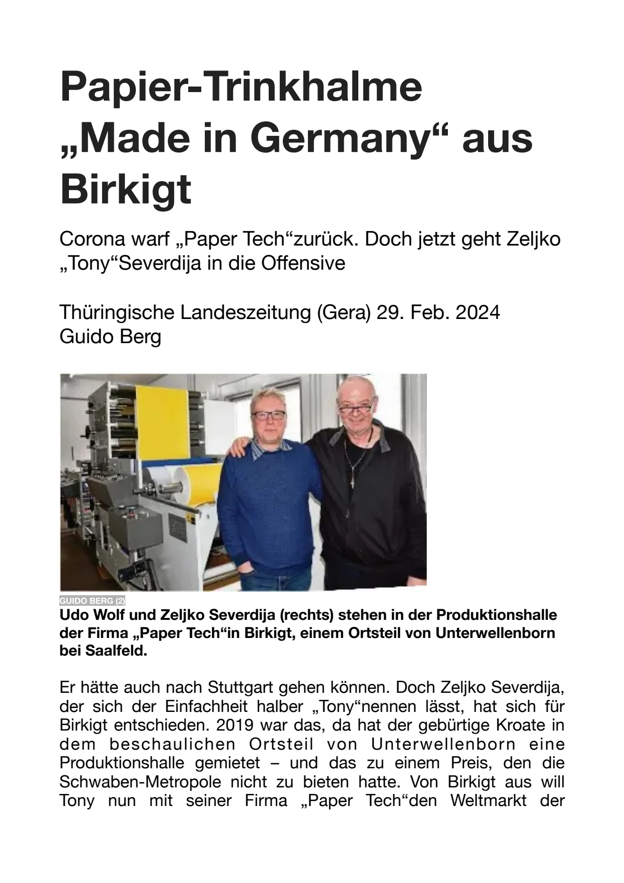 Was als Idee begann, wurde 2019 Realität mit der Gründung der Paper Tech Germany GmbH mit Sitz in Unterwellenborn. Der Fokus: Innovation und Verantwortung – gepaart mit einem kompromisslosen Anspruch an Qualität. In den folgenden Jahren entstand ein hochspezialisierter Maschinenpark, dessen Entwicklung 2021 und 2022 ein weiterer Meilenstein war. Im Süden Thüringens wird The Straw heute präzise, effizient und ressourcenschonend gefertigt – aus reinem Primär-Zellstoff.